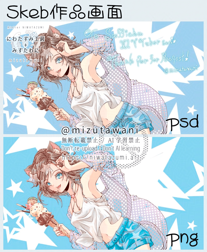 あと全部納品し終わってから気付いたのですが、PSDデータで納品した作品って色がSkebの画面だとすごいくすんじゃうんだ…!?