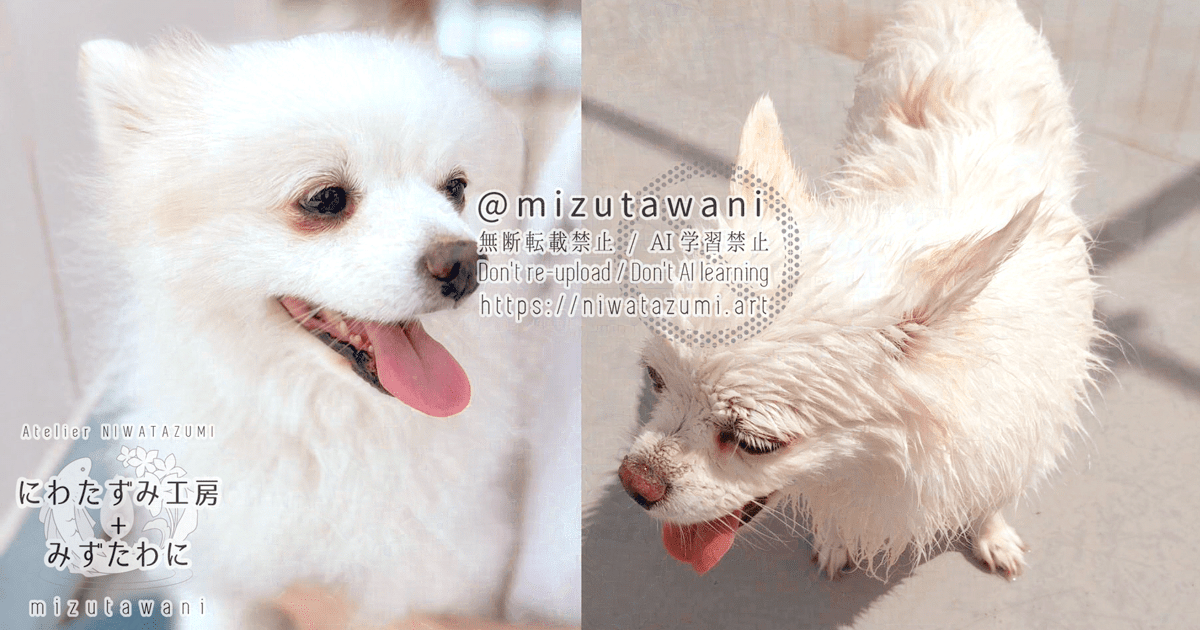 サムネ写真は親戚の子(3歳)が遊びに来て水遊びしてたんですが、がっつり全身に水をかけられたノイとビビって膝の上に逃げるリヒトです。